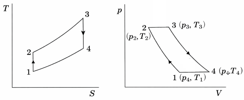 図:ブレイトンサイクルのT-S線図、P-V線図