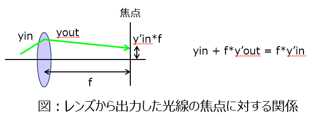 凸レンズに対する入射光線のy座標を$y_{in}$、接線成分を$dy/dz=y’_{in}$、出射光線のy座標を$y_{out}$、接線成分を$dy/dz=y’_{out}$とすると、下記の関係があります。