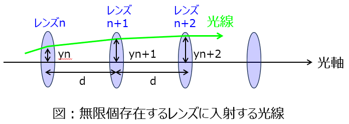 問1:$n$番目のレンズを通過する光線の縦軸方向の距離を$y_n$とするとき、$y_n,y_{n+1},y_{n+2}$の関係を求めよ。
