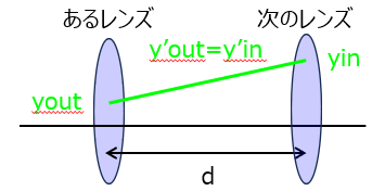 \begin{aligned}\begin{pmatrix}y_{out} \\ y’_{out}\end{pmatrix}=\begin{pmatrix} 1 & d \\ 0 & 1\end{pmatrix}\begin{pmatrix}y_{in} \\ y’_{in}\end{pmatrix}\end{aligned}