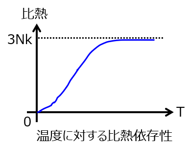 比熱は0になりました。これは、結晶中における熱励起できる粒子の減少を意味します。$(kT \ll h \nu)$で、$\nu$は振動数を意味するため、調和振動子内の高エネルギーの振動モードは温度によって殆ど励起せず、比熱の減少に寄与します。絶対零度付近になると、これが顕著になるため、比熱は0に漸近します。