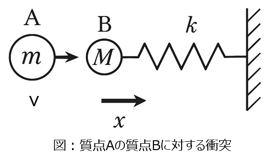 下図のように、速度$v$で運動している質量mの質点Aがばね定数$k$で固定壁に接続されている質量$M$の質点Bに衝突する場合を考える。速度$v$で運動する方向を$x$軸の正の向きとし、下記の問いに答えよ。