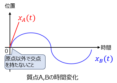 (15)式、(21)式の交点が存在しない条件を満たすとき、質点A,Bは再衝突しない。