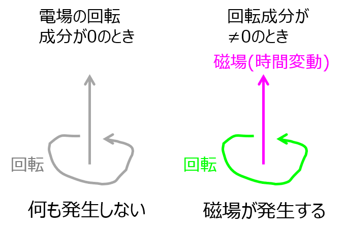 も非零になるから、時間変動する磁場が発生します。磁場の発生源は電流ですから、時間変動する電流(電場)も存在すると解釈できます。背理法により、静電場であるためには回転成分が0である必要が分かりました。