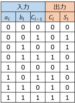 下位bitからの繰上りが無く$C_{i-1}=0$、A,Bのbitの内1つだけ1ならば\(S_{i}=1\)を出力します。また、全ての入力が1ならば、全ての出力\(C_{i},S_{i}\)が1になります。結局、3つの入力のうち、奇数個が=1ならば、$S_i=1$である整理ができます。