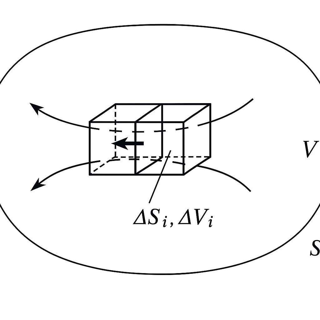 ある閉曲面(3次元)内のベクトル場\(\boldsymbol{A}\)の発散\(div\boldsymbol{A}\)は、閉曲面を囲む閉曲面Sでベクトル場を面積分した値に等しいことを言います。