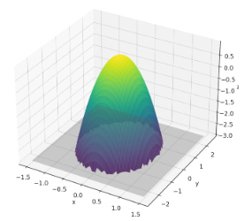 \(z\)の下限は-3、上限は\(1-4x^{2}-y^{2}\)であることが分かります。楕円放物面であり、下記のような概形になります。