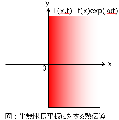 下記のように、内部に熱源を持たない半無限長の平板の表面に熱振動を与えた時の内部熱伝導を考える。単位体積当たりの熱容量を$C$、熱伝導率を$\lambda$、熱拡散率を$k$とした時、下記の問いに答えよ。