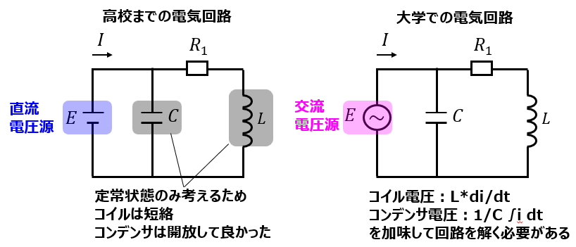 計算に複素数、行列、微分方程式が入るようになった。ことに尽きます。オームの法則、キルヒホッフの法則の使用を基本として回路方程式を立てることに変わりませんが、数学的な計算が難しくなります。高校までは、電圧は直流源で抵抗素子しか考えないことが多く、実数だけで回路方程式を表現できることが多かったです。コイル、コンデンサが回路上に存在しても、定常状態のみ考えればよく、計算に微分項、積分項は存在しませんでした。よって、大学入試レベルの問題でも、中学数学レベルの計算で解くことができました。
