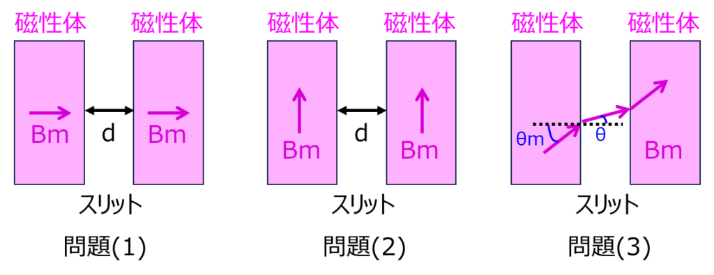 下記のように、無限に広がっている磁性体の内部に厚さdのスリットを設ける。磁性体内部の磁場が(1)~(3)それぞれの場合でかかっている時、真空領域で発生する磁場\(H\)と磁束密度\(B\)を求めよ。なお、磁性体の透磁率を\(\mu\)、真空中の透磁率を\(mu_{o}\)とする。