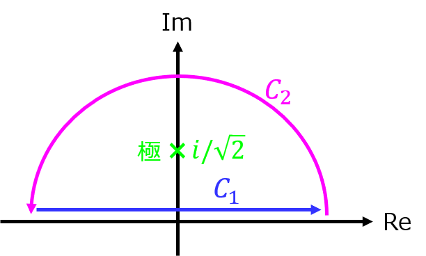- 実軸上の積分値\(C_{1}\)=(1.で求めた積分結果)になり、題意を満たす。