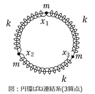 問:質量\(m\)の3個の質点をばね定数\(k\)のばねを用いて円環上に連結する。質点1,2,3の位置を\(x_{1},x_{2},x_{3}\)とするときの基準角振動数\(\omega_{1},\omega_{2},\omega_{3}\)を求めよ。