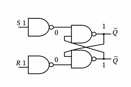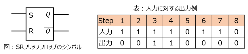 二入力(S:セット、R:リセット)を用いて、出力0,1を切り替える順序回路になります。一度S=1を入力すると、リセットR=1を入力するまで出力1を立て続けます。(ラッチ)