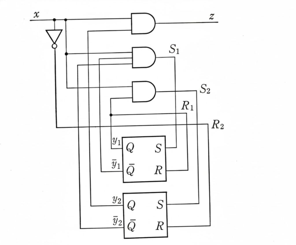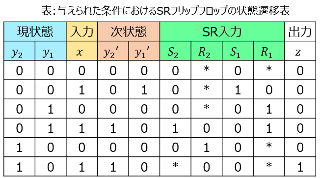 表題のように、決まった入力系列、または真理値表を与えてそれを状態遷移表に落として回路にする問題が頻出です。Dフリップフロップ、JKフリップフロップで問われる場合もありますが、それは過去の記事で紹介しています。SRフリップフロップでも表せるようになれば、順序回路において基本的に穴が無くなります。