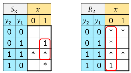 - $S_2,R_2$のカルノー図、論理式