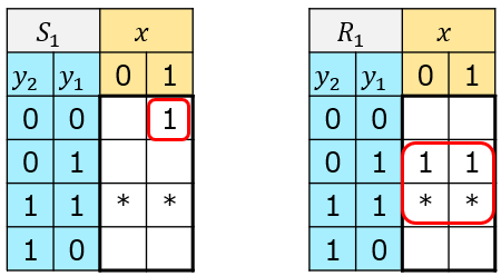 - $S_1,R_1$のカルノー図、論理式