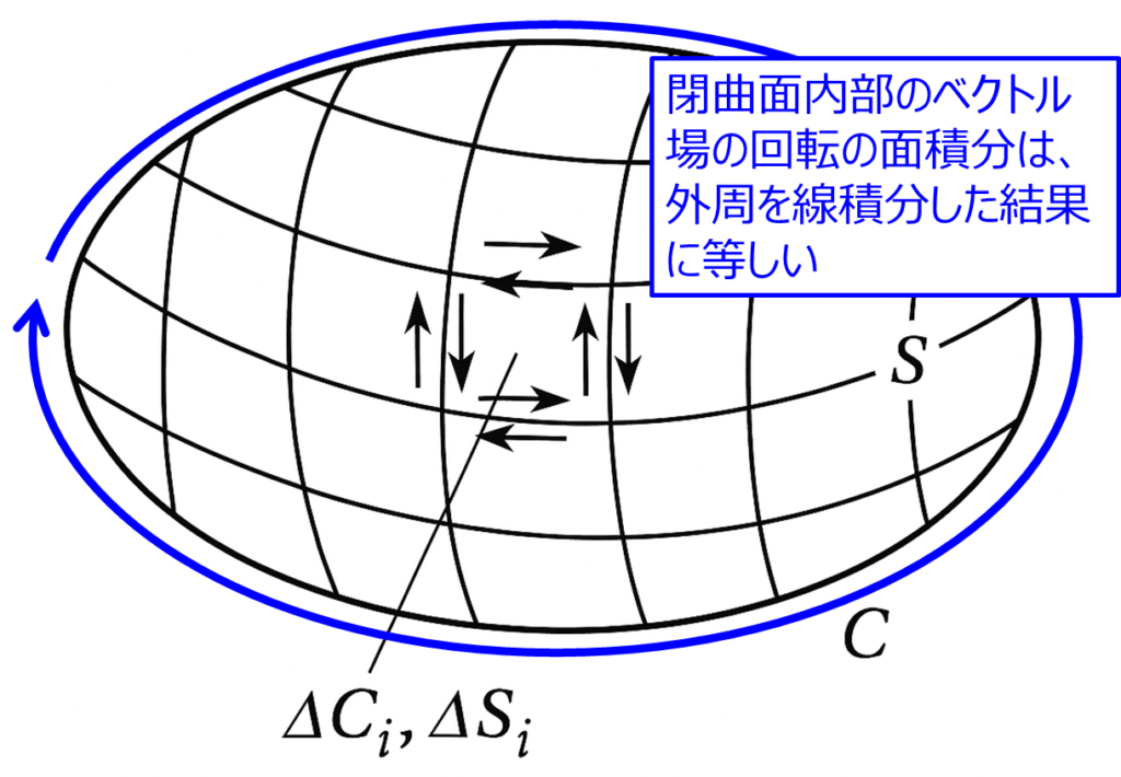 あるベクトル場の回転の面積分は、面積分した領域の境界線を線積分した値に等しいことを言います。下記の計算式で表されます。