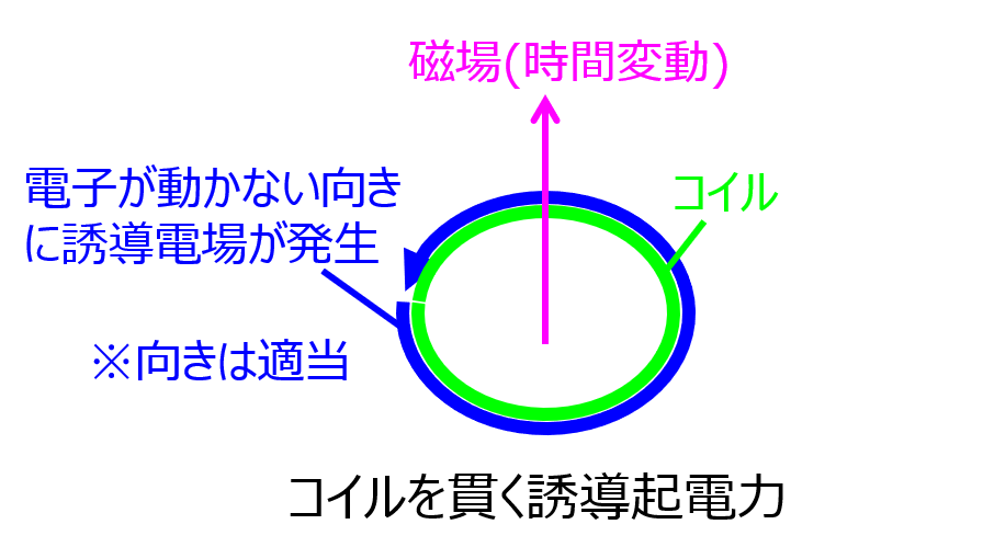 誘導起電力はコイルの円環に対して発生するわけですから、コイル内に誘導電場$\boldsymbol{E}$が生じていると考えられます。これをコイルの形状に対して線積分し