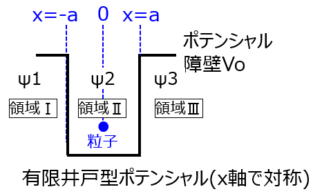 例として、\(|x|>a\)はポテンシャル障壁\(V_{o}\)、他の領域では変わらず\(V_{o}=0\)の有限井戸型ポテンシャルを考えます。