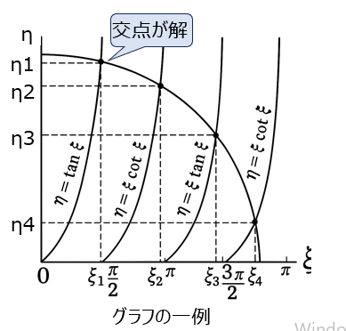 $\xi,\eta$の具体的な値を計算で求めることはできないが、(25)式、(26)式をグラフ化し、おおよその値を考えることができる。(グラフの交点)